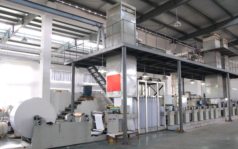 采用雙工位放紙,儲(chǔ)紙機(jī)構(gòu),及接紙臺,使其換紙過程中不需要停機(jī)或減速,采用柔性版,翻轉(zhuǎn)機(jī)構(gòu),實(shí)現(xiàn)正反面同步印刷。在印刷前增加一組上粉進(jìn)行紙張預(yù)處理,使紙面缺陷得到填補(bǔ) ,并消除紙毛等雜物提高印刷質(zhì)量,印刷后在進(jìn)行上粉、上光、壓光、壓布紋、縱切,橫切 ,撲克牌收集。紙邊通過吸風(fēng)裝置自動(dòng)收集到廢料庫。全機(jī)采用PLC程序化控制,變頻調(diào)速,自動(dòng)張力控制系統(tǒng),電腦自動(dòng)糾編系統(tǒng),縱切采用光電跟蹤糾編系統(tǒng),印刷套準(zhǔn)采用高速攝像,靜止畫面360%行星齒輪套色系統(tǒng)。